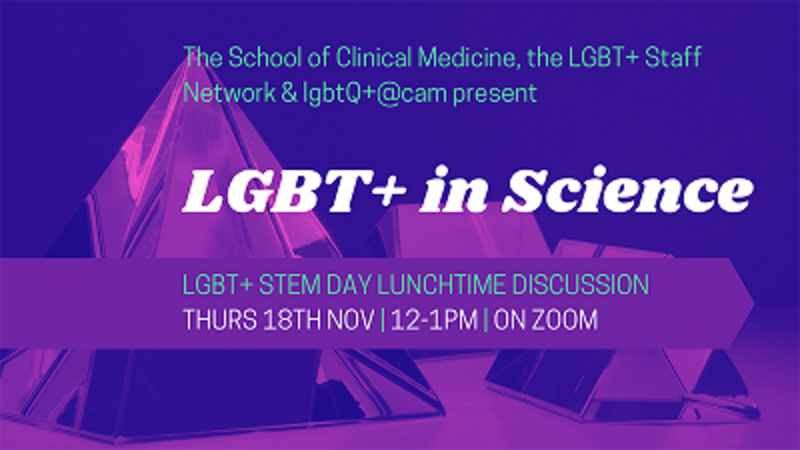 | LGBT+ in Science - an LGBT+ STEM Day lunchtime panelThursday 18th November 2021, 12 - 1pmWhat’s it like to be out in science? Our stereotypes of scientists might not include queer people, but this is changing. You’ll find LGBT+ people at the lab bench, in the lecture theatre, the library and in the clinic. LGBT+ STEM Day is an international day that celebrates and showcases the lives and work of those scientists. It also serves to highlight inequalities that persist and opportunities to make science and workplaces more inclusive. Join us as we discuss experiences of being of a marginalised gender or sexuality within science. This seminar is for everyone, so even if this isn’t a topic you’ve previously considered, this is the perfect opportunity to learn more about making STEM inclusive. Facilitated by Duncan Astle (Chair, LGBT+ Staff Network) and Lucian Stephenson (LGBTQ+@cam Programme Co-ordinator), and hosted by the School of Clinical Medicine. Panellists: Camilla Nord PhD, (MRC Cognition and Brain Sciences Unit, School of Clinical Medicine) |